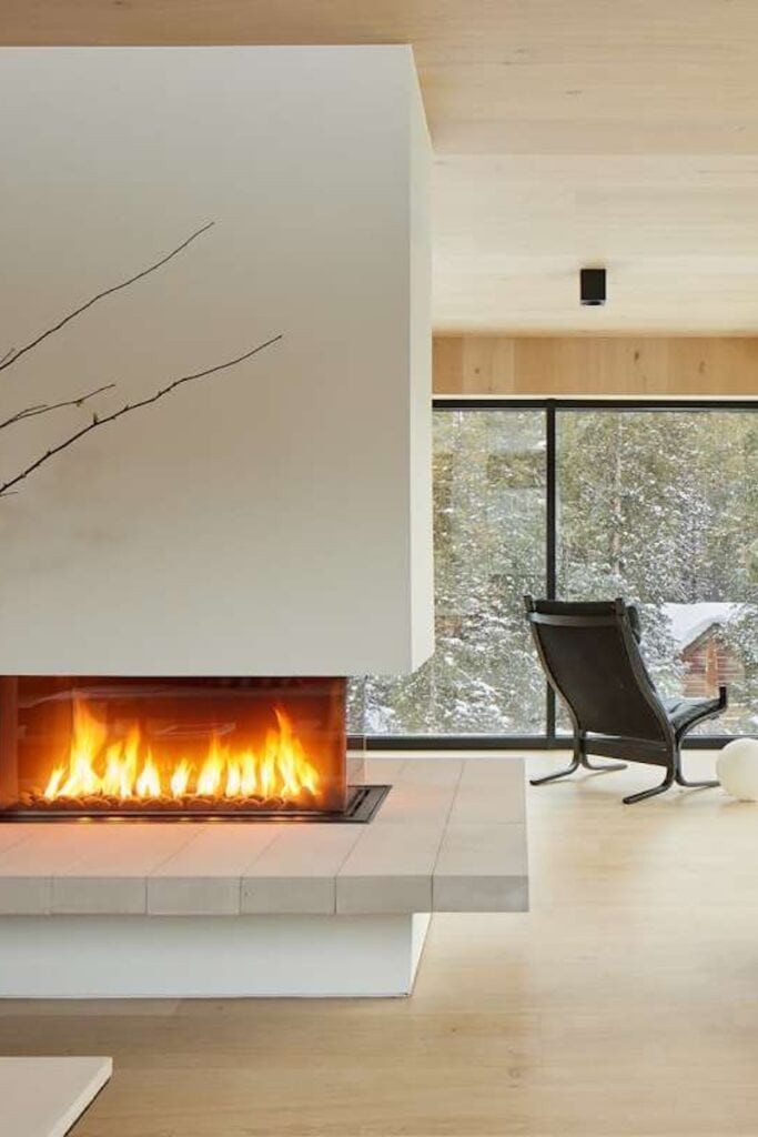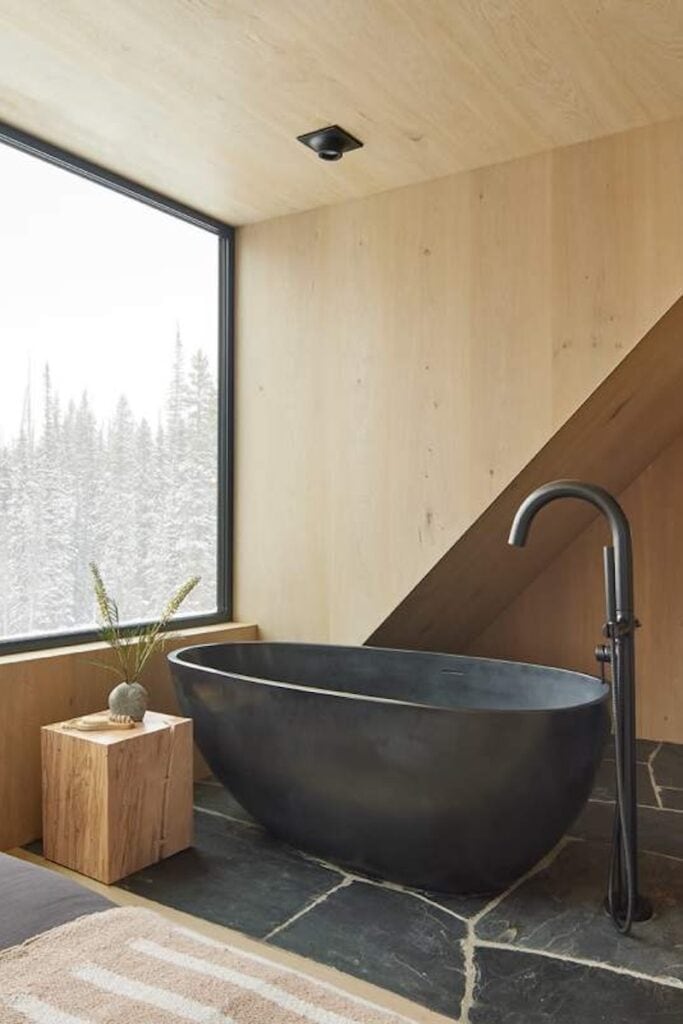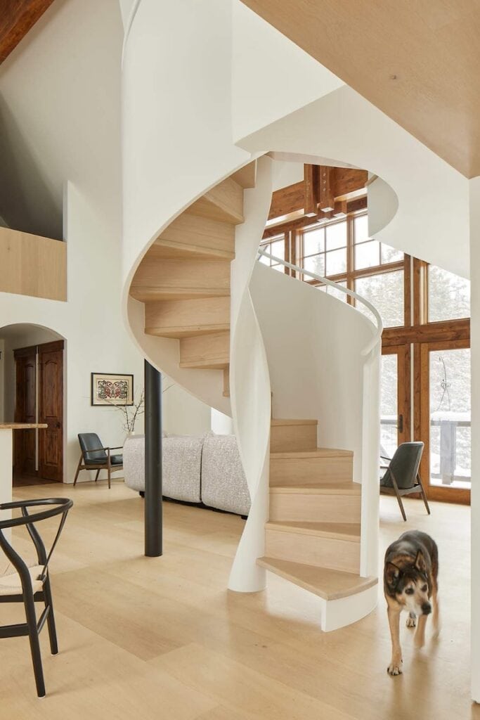 Rather than demolishing the original structure, Yuri’s design reinterprets and expands it. Southern-facing windows and skylights are strategically placed to capture passive solar energy, while slate flagstone floors flow from the inside out, blurring the line between the built environment and the natural one. Built-in furniture crafted from the same white oak integrates seamlessly, making the furniture feel like architecture and the architecture feel like furniture. The result is a totally unique, high-altitude luxury house with an unmistakable minimalist cabin vibe.